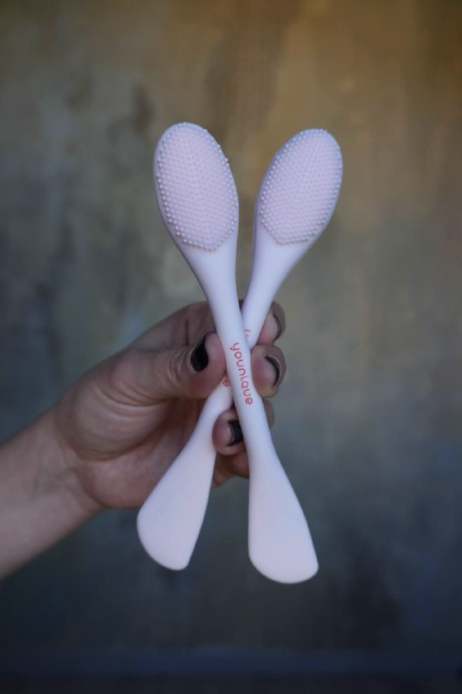 The exfoliator has two sides: one to gently buff away dullness, and one to soften and smooth everything out. And the spatula? Perfect for keeping your products clean, mixing, scooping… all the things.