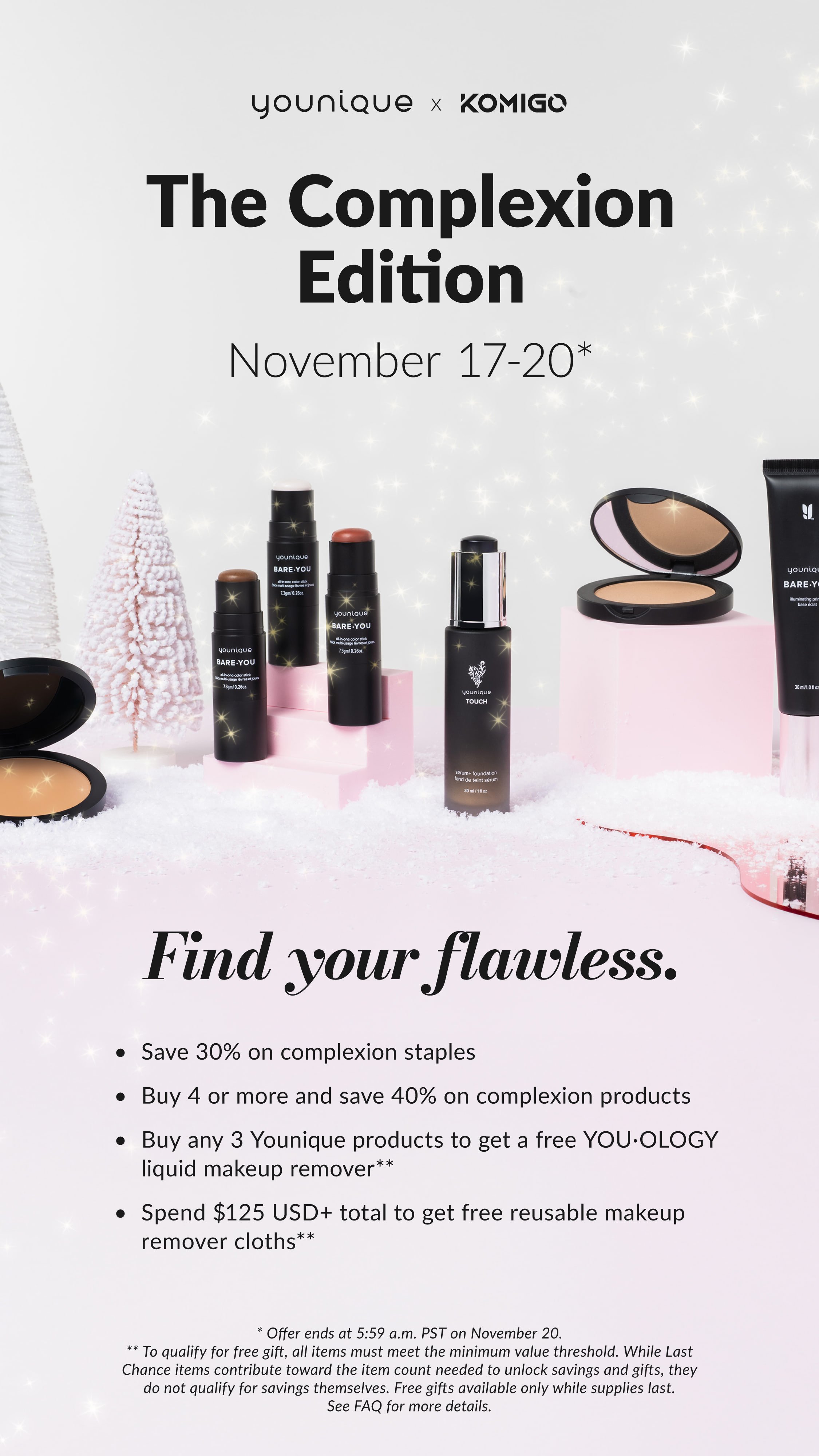 Complexion Perfection is officially here and up to 40% off, and this lineup deserves its own spotlight. You can mix and match all the essentials: primer, foundation, pressed powder foundation, SERUM+ foundation, BB cream, cream foundation, concealer, and Bare You Sticks to build the smooth, bright, effortless base you’ve been wanting. And the perks are so good: buy any 3 complexion products and get a free liquid makeup remover, or spend $125 and you’ll also receive the reusable makeup remover cloths. Whether you’re restocking your favorites or refreshing your whole routine for the holidays, now’s the time. Message me if you need a shade match!